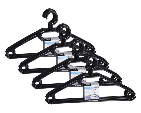 Set met 10 kunststof kleerhangers met draaibare haak, geschikt voor het ophangen van broeken, blouses, pakken, jasjes etc. Vervang nu al je oude hangers door deze kunststof hangers met ribbels voor extra grip. Je krijgt bij je bestelling van 10 hanger, 30 hangers gratis. Je zult je nooit meer ergeren aan kleding die onderin in
